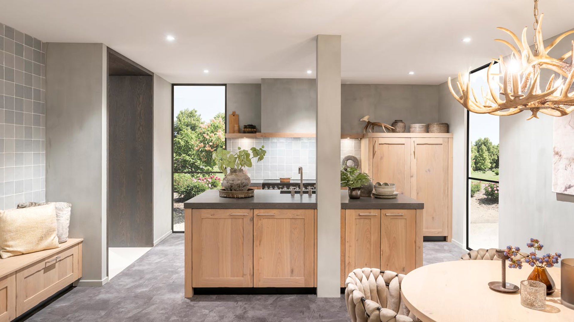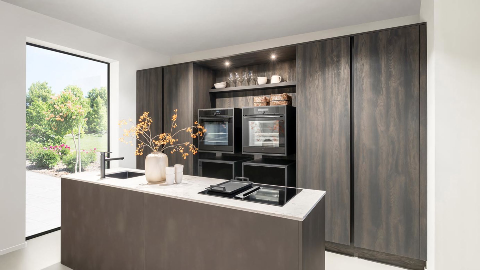 Als een keukeneiland in betonlook te kil is, dan kan een houten kastenwand een mooie warme tegenhanger zijn. Uiteraard kan het ook andersom: wanneer het keukeneiland hout heeft in de fronten, dan kan de kastenwand met betonlook worden uitgevoerd. Deze keukens zijn helemaal af met een design afzuigkap.