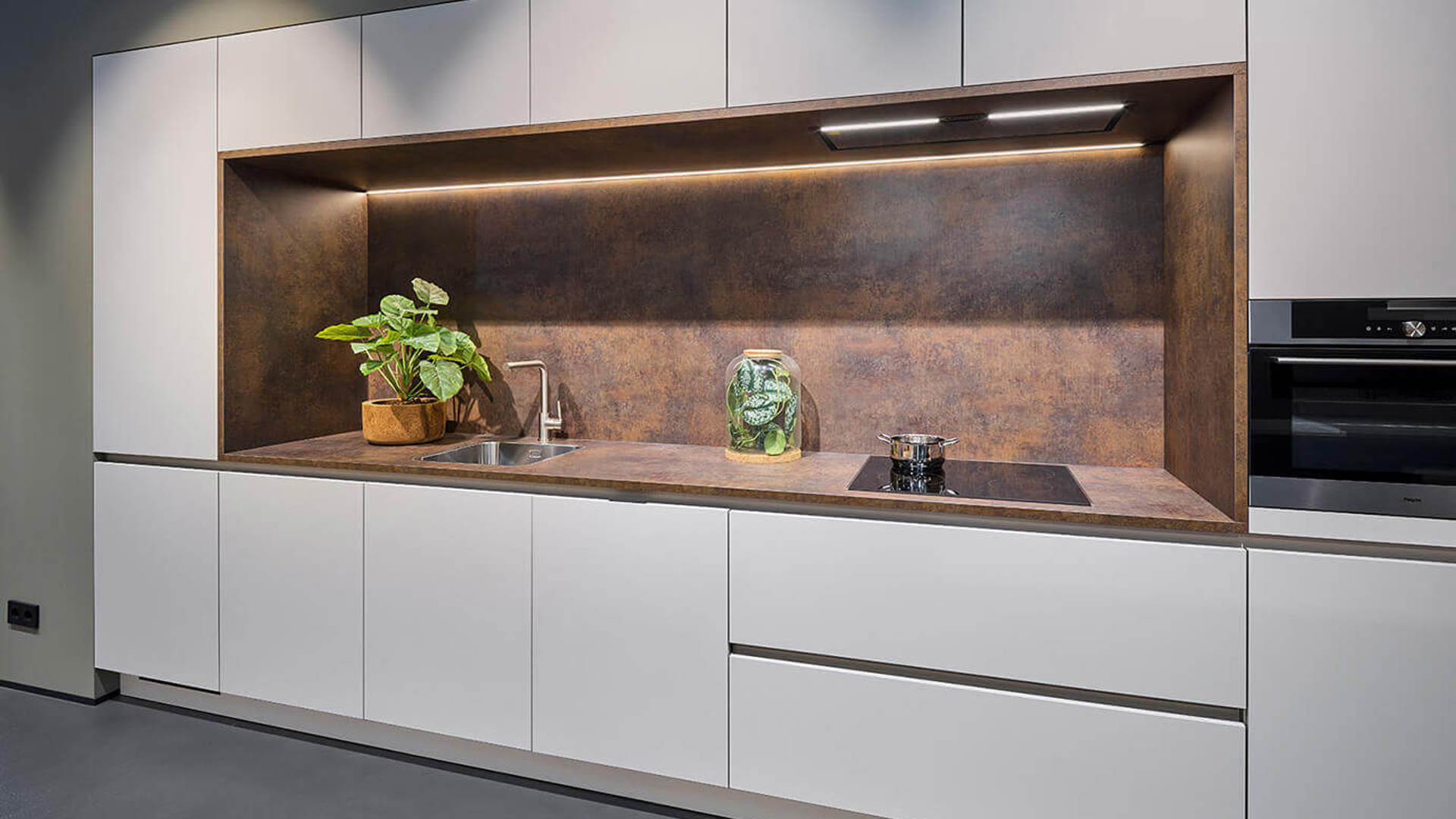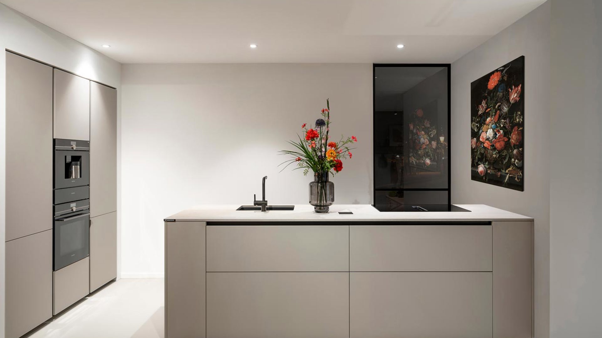 De strakke keuken zonder bovenkastjes wordt bijvoorbeeld opgesteld tegen een strak gestucte wand, met een rechte opstelling van onderkasten. De keuken oogt hierdoor ruimtelijk, overzichtelijk en stylish.