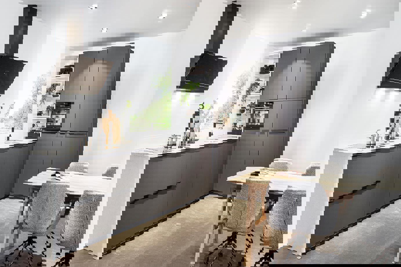 Met een antraciet werkblad (keramiek) is deze keuken compleet in stijl. Een houten koffiecorner brengt een levendig accent en geeft deze hoek een eigen sfeer.