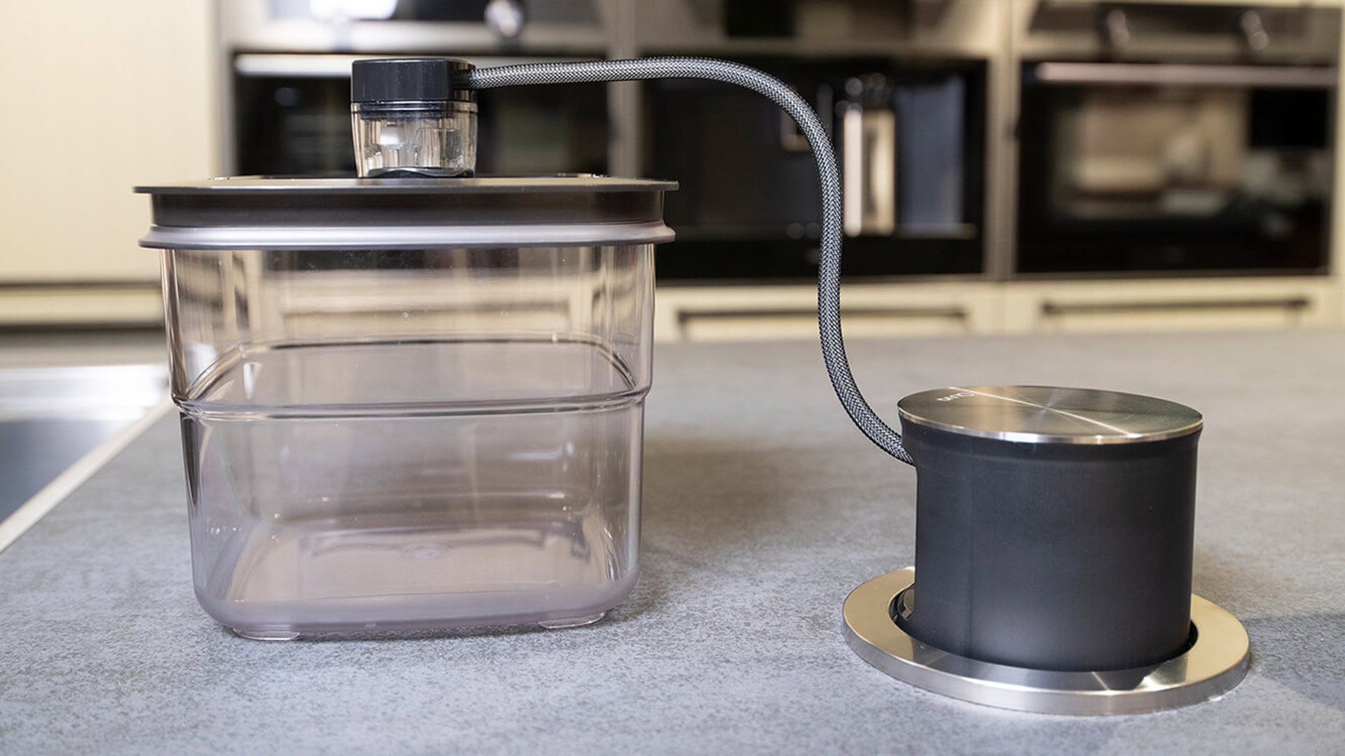 Deze luchtdichte verpakker kan volledig worden geïntegreerd in het aanrechtblad. Wanneer je hem niet gebruikt is hij verzonken in het blad en is alleen de rvs of mat zwarte metalen ring zichtbaar.