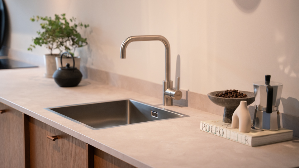 De Japandi-stijl brengt Scandinavische en Japanse invloeden samen. Twee stijlen waarin het draait om minimalisme en rust. Kenmerkend zijn afgeronde hoeken, geen rechte vormen. En natuurlijke materialen, zoals hout, bamboe en steen. “Japandi zorgt voor een elegante en rustige ruimte. Het is een woon- en keukenstijl zonder veel tierelantijntjes”, legt verkoopmedewerker Demi uit.