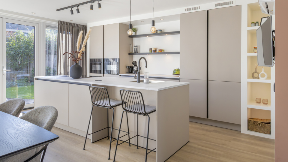 Een koffiecorner komt meestal in een nisje in de kastenwand. Dat kan heel goed in een parallelkeuken. Maar ook bij een kookeiland met kastenwand. Cornelis: “Klanten combineren het met wandplanken erboven. Perfect voor het opbergen van kookboeken of mokken. En een lade eronder is ideaal voor je koffiecups, theezakjes en lepeltjes.”