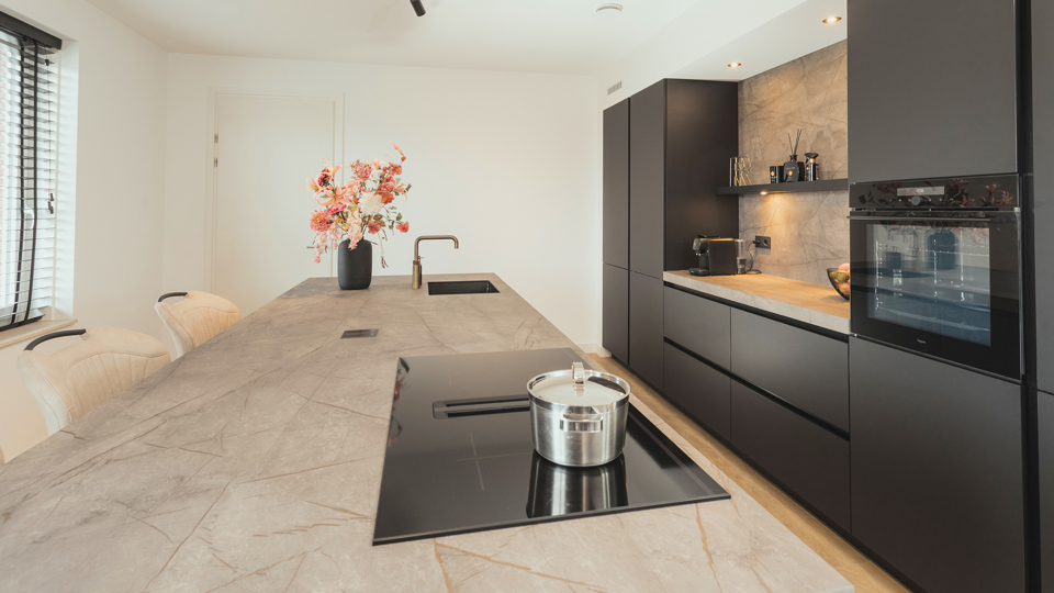 Ook werkbladen zijn trendgevoelig. Bij stenen werkbladen zie je steeds vaker een ronde afwerking. “Denk aan een kookeiland met afgeronde kasten en een rond werkblad. Helemaal van nu én het past perfect bij de populaire Japandi-stijl", vertelt Melissa. Ook de dikte verandert. “Werkbladen worden steeds dunner. Soms zijn ze slechts 1,2 cm.”