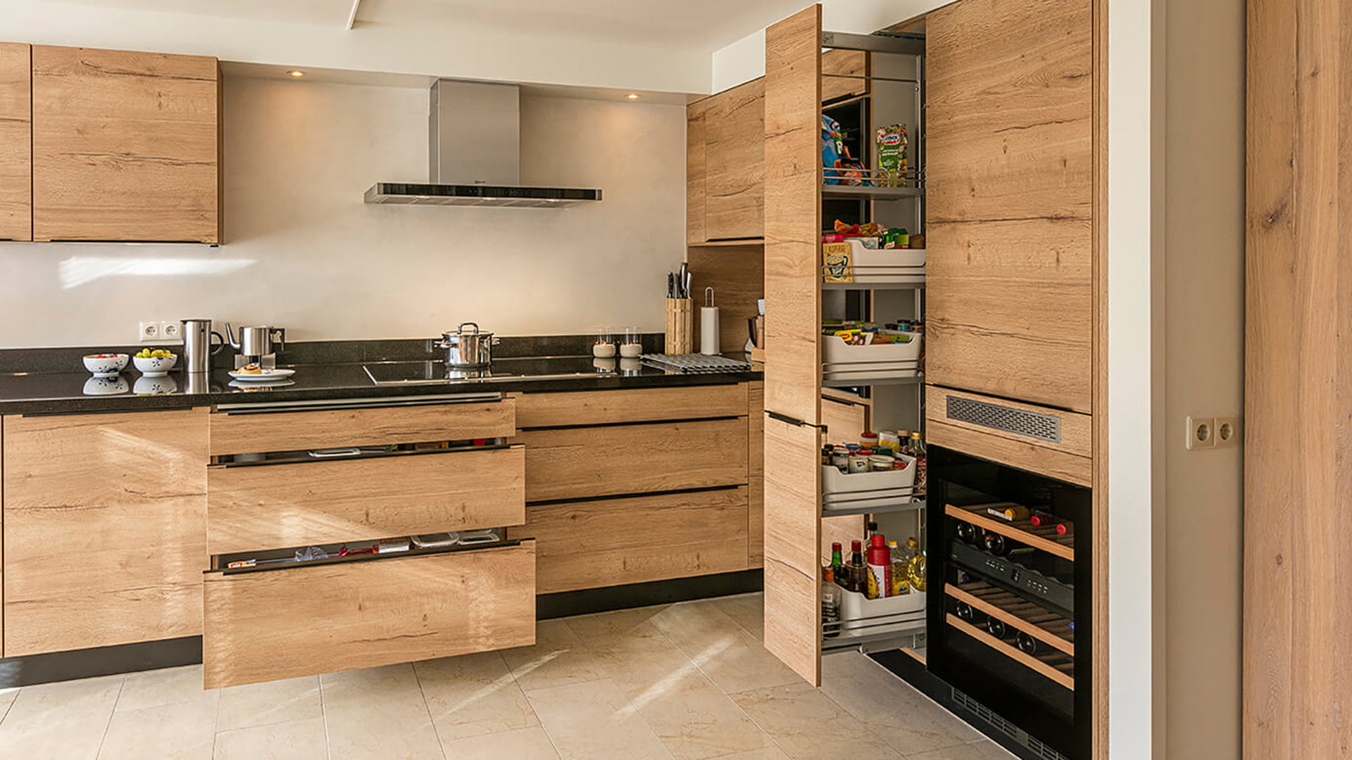 Daarnaast is het functionaliteitsprincipe ver doorgevoerd en is deze houten keuken van een extra diep werkblad voorzien.