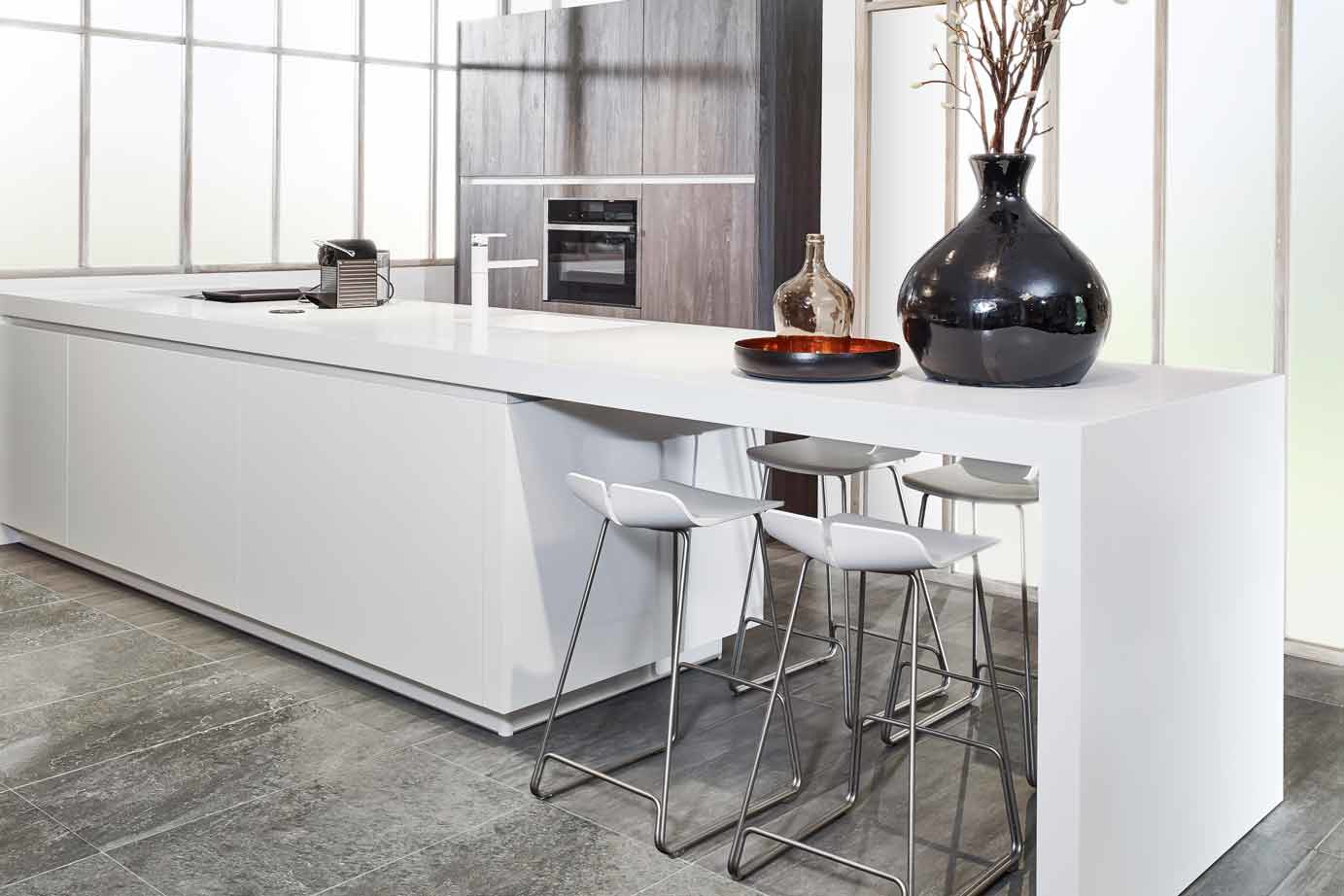Heb je een mooie keuken met kastenwand en eiland, dan kun je je aanrecht verlengen met hetzelfde materiaal zodat je een tafelblad hebt. Dit is een strakke oplossing voor moderne keukens en het oogt bijzonder chique.