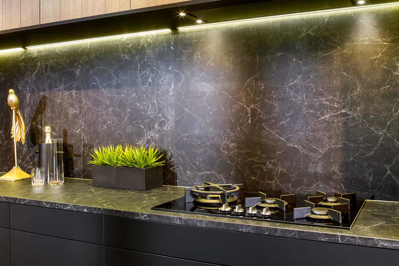 In gekleurde keukens zoals zwarte keukens of witte keukens is een marmer achterwand boven het aanrecht een optie. De sprekende tekening van dit materiaalsoort geeft een geweldig levendig accent en vormt een schitterend contrast met het rustige zwart of wit.