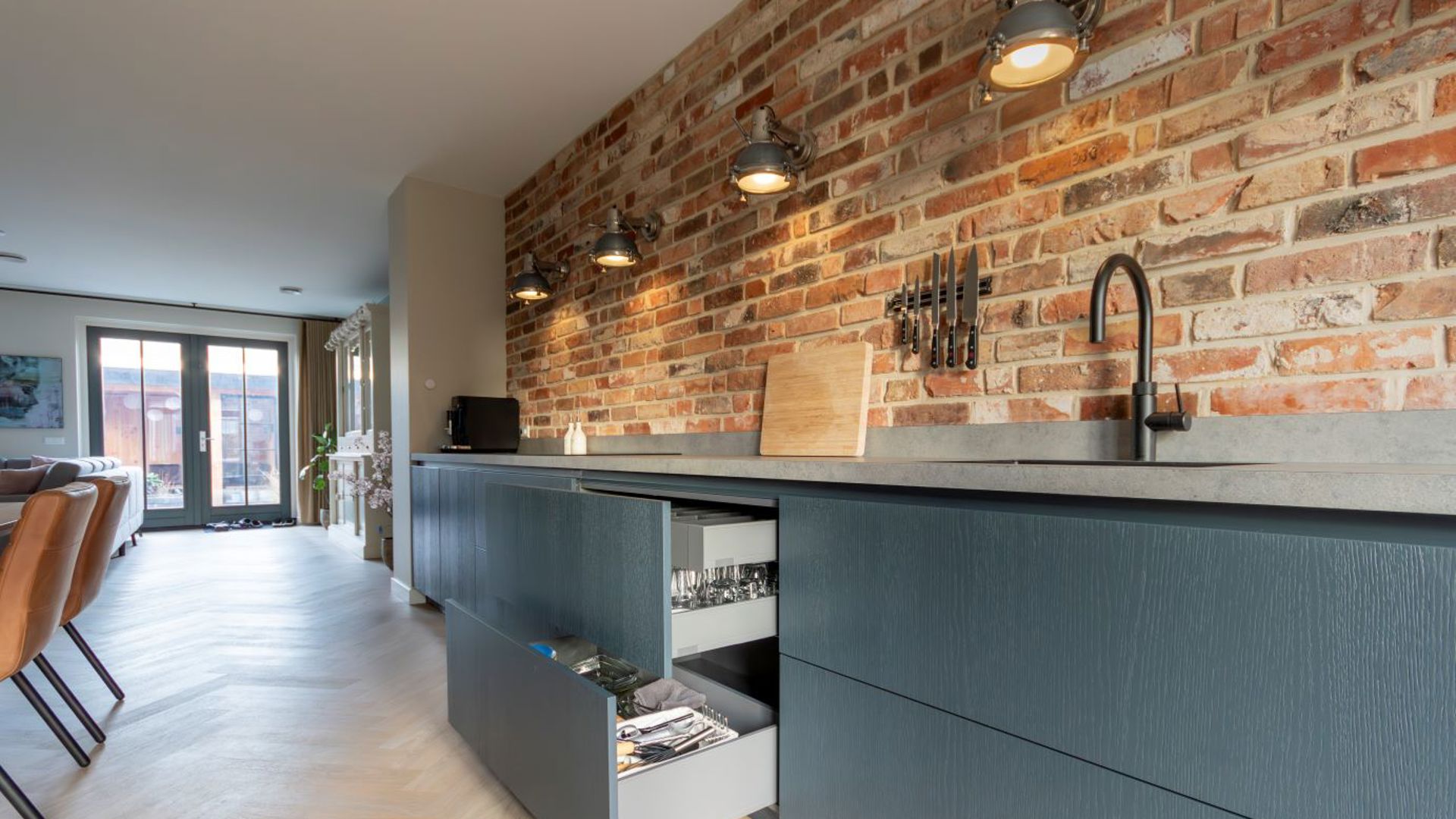 Heb je eenmaal een prachtige open keuken, dan is het belangrijk het aanrecht zo leeg mogelijk te houden. Jenneke: “Ik zeg altijd: de kunst van het inrichten, is het weglaten. Zeker bij een open keuken. Want als je aan het koken bent, staat je aanrecht zo weer vol. Met een Quooker heb je geen waterkoker meer nodig. Dat scheelt weer op het aanrecht. Houd het bij een mooie koffiemachine en een grote vaas met bloemen.”