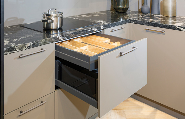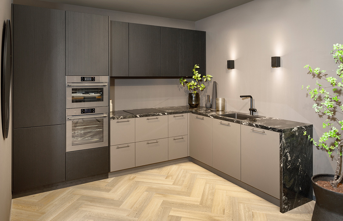 Deze keuken laat zien hoe strak design en warme materialen elkaar versterken. Je ziet direct de rust en balans die ontstaat door de combinatie van donkere houttinten, zachte zandkleuren en een krachtig natuurstenen werkblad. Alles klopt. Van de de grepen tot fronten. Dit is een keuken waarin aandacht zichtbaar wordt en waar je elke dag met plezier samenkomt.