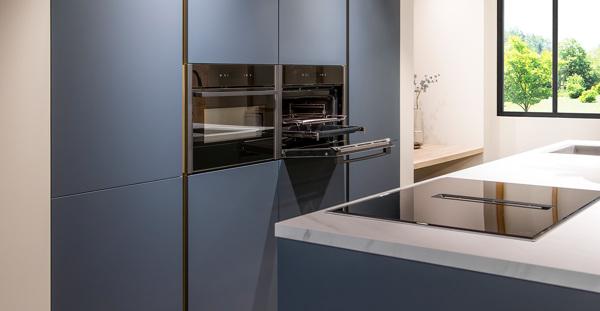 De keuken is uitgerust met NEFF apparatuur, waaronder innovatieve ovens met handige functies en een strakke, moderne uitstraling die perfect past bij het ontwerp van de keuken.