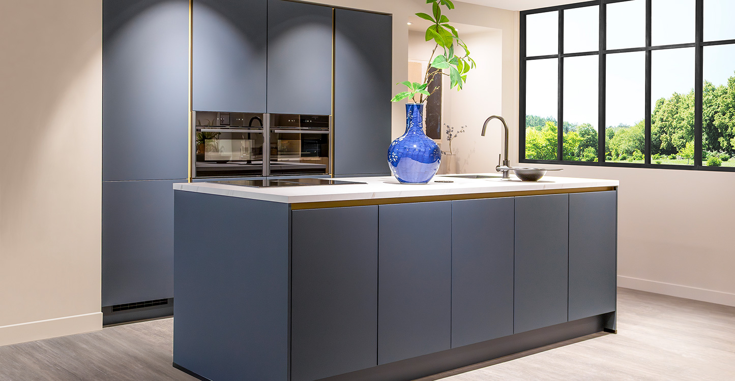 Deze moderne keuken straalt elegantie en functionaliteit uit met zijn strakke lijnen en stijlvolle afwerking. De blauwe kasten en het witte werkblad creëren een eigentijdse en verfijnde uitstraling. Een opvallend kenmerk is het centraal geplaatste eiland, dat niet alleen dient als werkruimte maar ook als ontmoetingsplek.