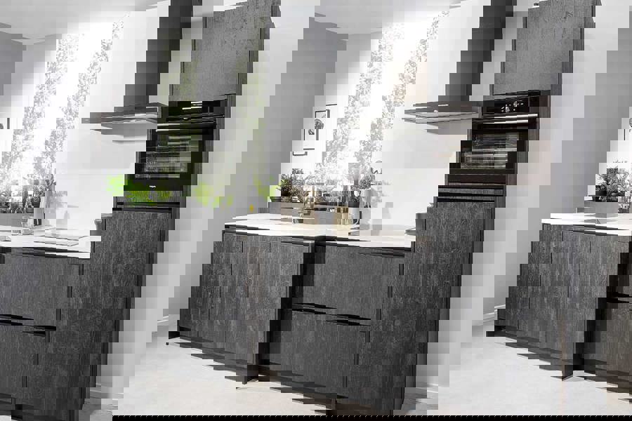 Ontdek de perfecte balans tussen kracht en elegantie met deze industriële keuken van Excellentic. De combinatie van een robuust composieten werkblad in Turbine Grey, stijlvolle fronten in Sherwood Park vert.syn.Por en het verfijnde Fenix Green keukeneiland zorgt voor een moderne uitstraling met karakter.