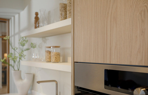 Nordic Stillness gaat letterlijk over verstillen. Dat zie je bijvoorbeeld aan de grijsblauwe keukendeuren, waarvan de kleur is geïnspireerd op de winterse Scandinavische luchten. De tijd waarin het koud is, de natuur wordt gevangen – en stilgezet – in een laagje ijs of sneeuw en wij ons terugtrekken in onze veilige haven: ons warme thuis.
