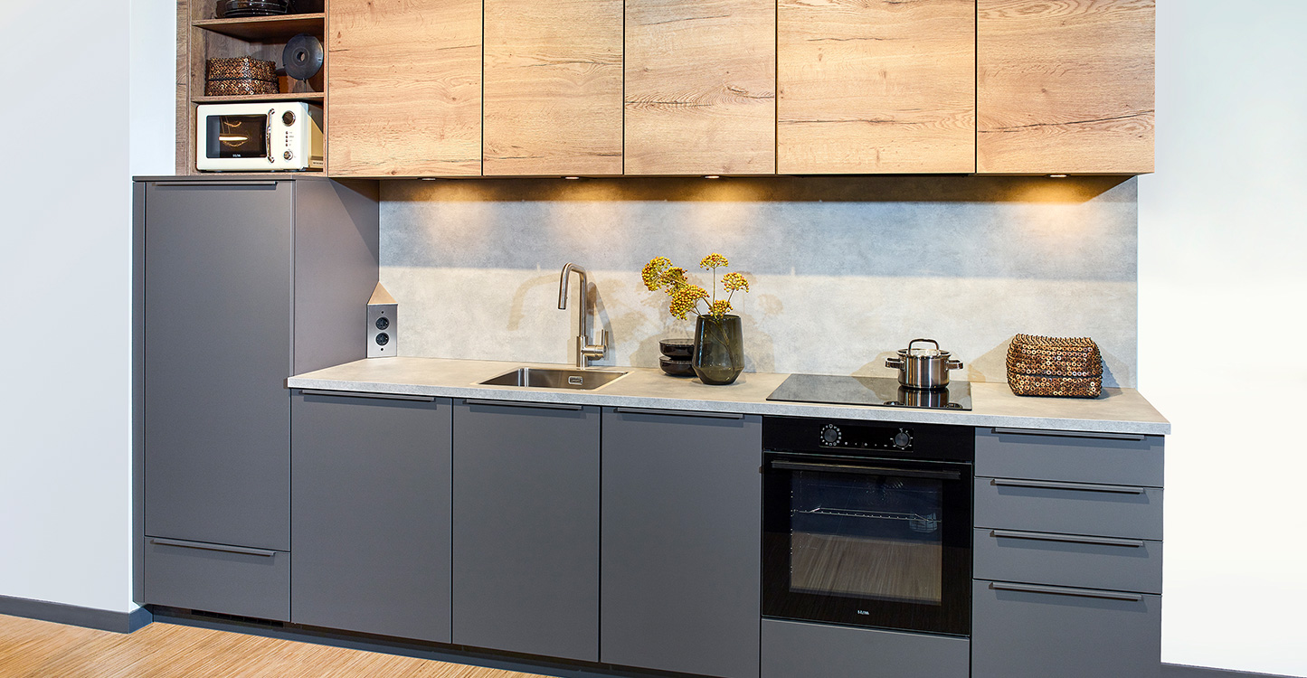 Deze compacte keuken biedt ondanks zijn grootte alle voorzieningen die je nodig hebt. De combinatie van matte grijze onderkasten en warme houten bovenkasten zorgt voor een moderne en stijlvolle uitstraling. Een keuken die zowel functioneel is als stijlvol.