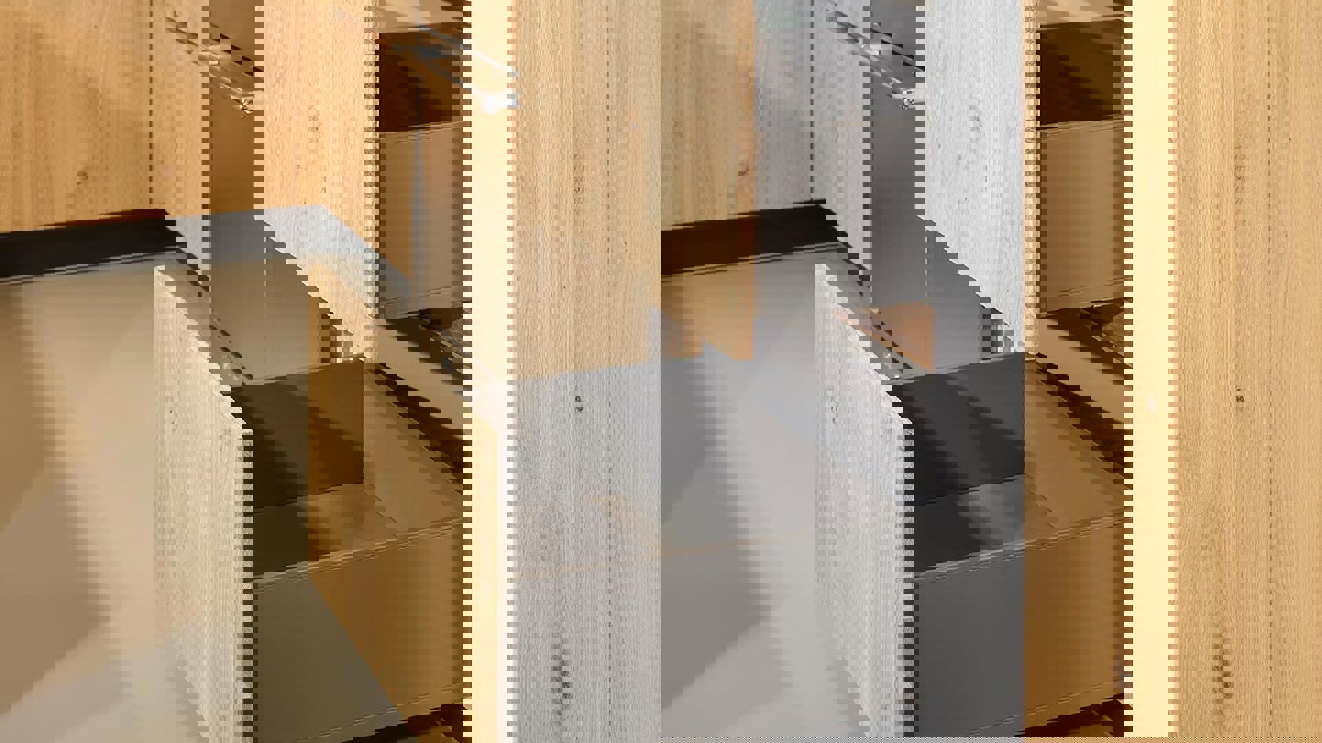 Een moderne houten keuken, uitgevoerd in een u-opstelling. De keuken is voorzien van een inductiefornuis. Door de u-opstelling met hoge kast is er veel opbergruimte aanwezig.