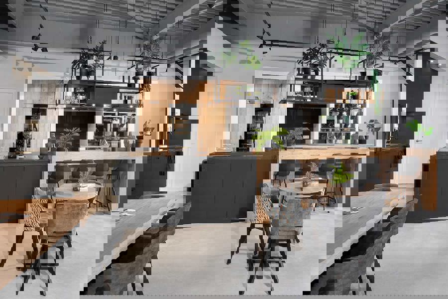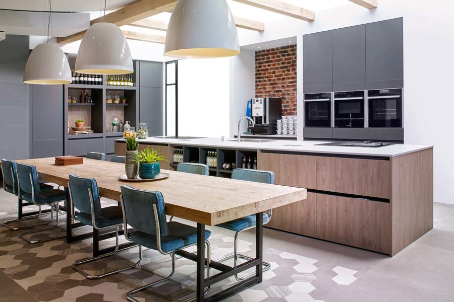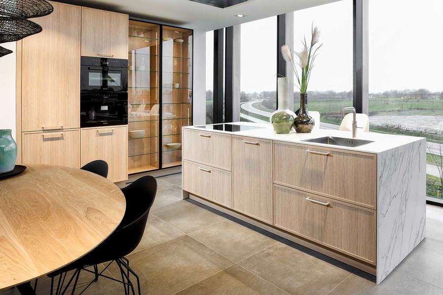 Bekijk deze ruime, moderne keuken met eiland. Door de combinatie van de twee verschillende fronten naast elkaar, ontstaat er een moderne, warme keuken.