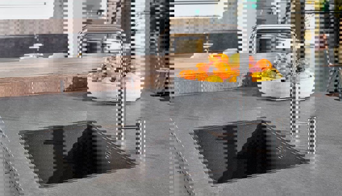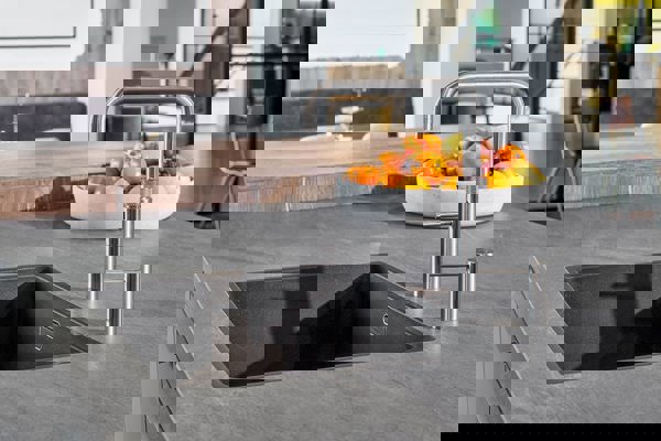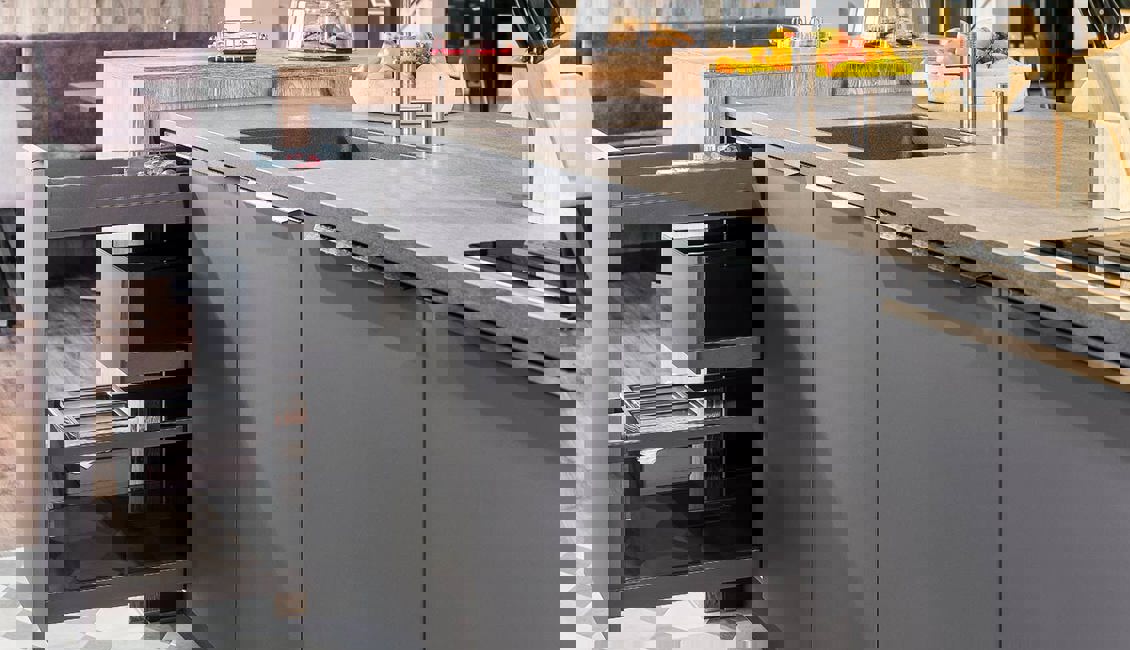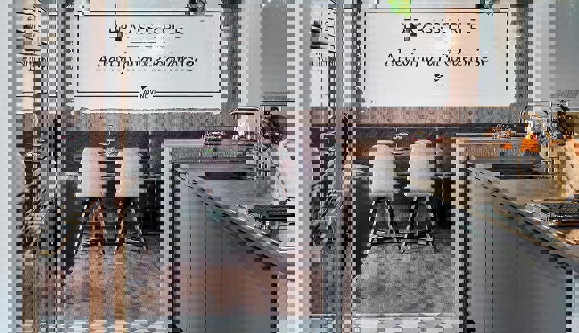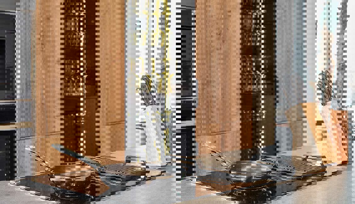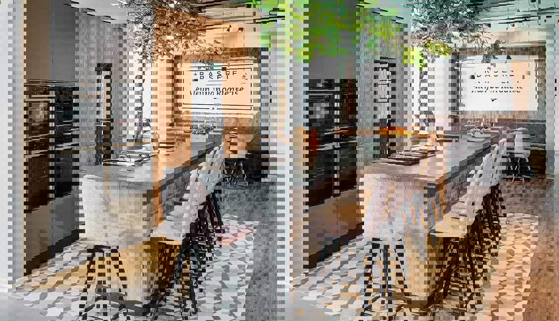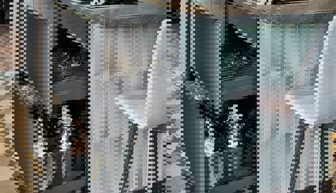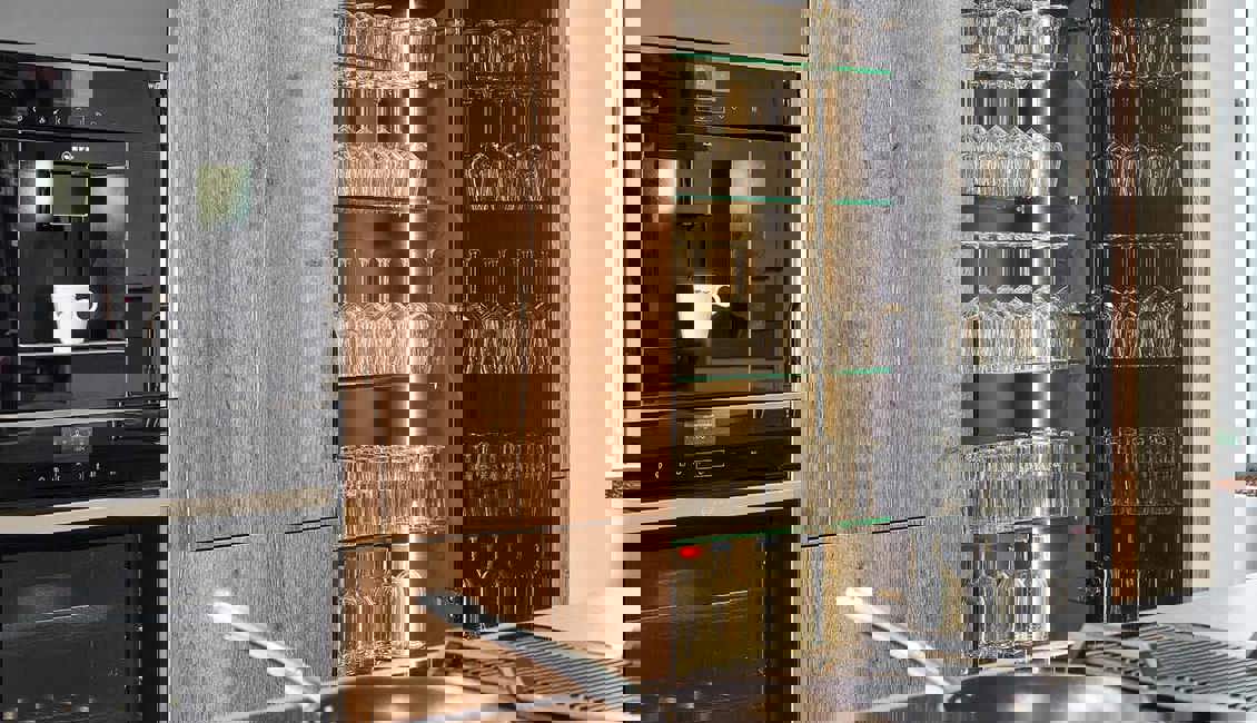 De keuken is voorzien van NEFF apparatuur en een keramiek werkblad. De lades zijn luxe uitgevoerd met donkere glazen zijwanden en let ook eens op de bijzondere tegels aan de zijkant van het eiland.