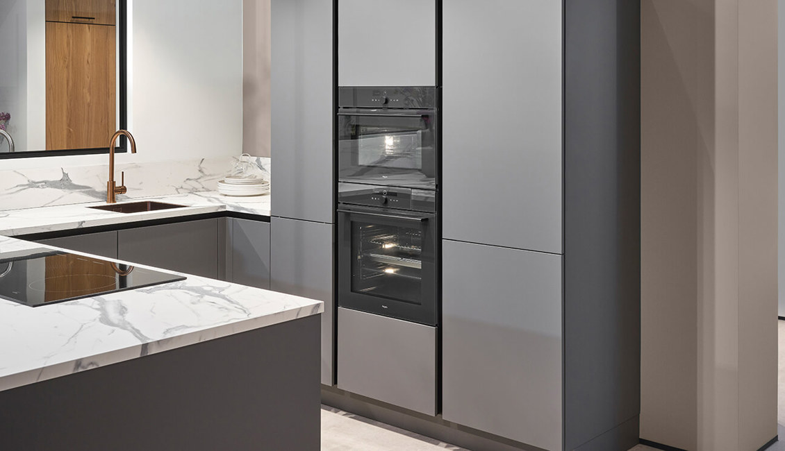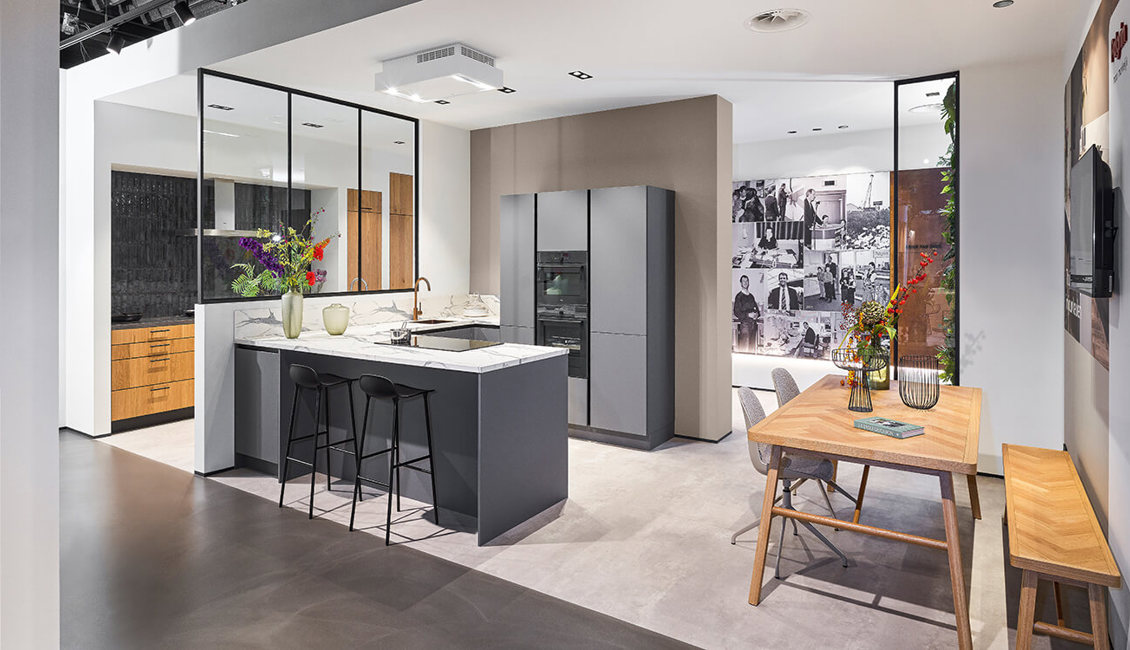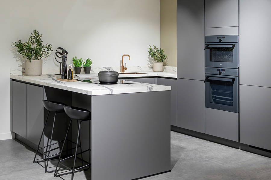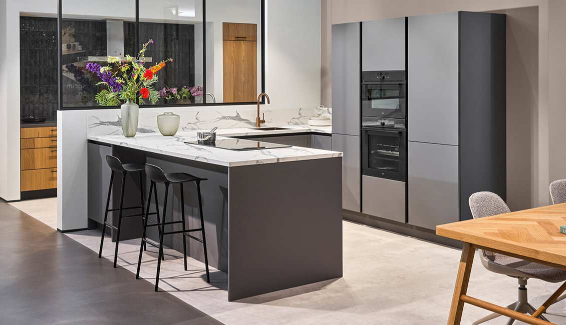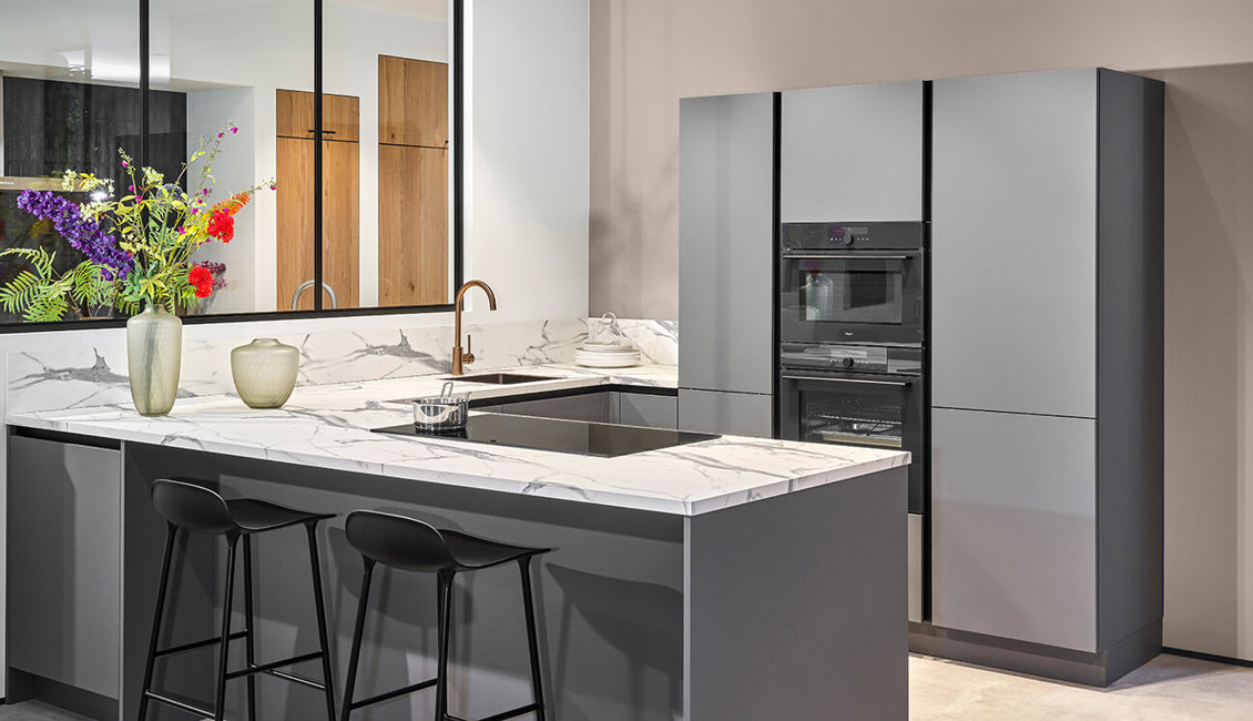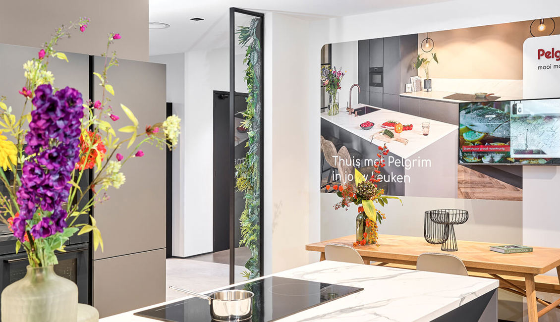 Deze moderne U-keuken is een strakke en eigentijdse keuze met hoogwaardige apparatuur van Pelgrim. De donkere kleuren geven deze keuken een elegante en luxe uitstraling, terwijl de slimme indeling van de kasten zorgt voor voldoende opbergruimte. Ideaal voor wie op zoek is naar een eigentijdse keuken met een optimale werkruimte.