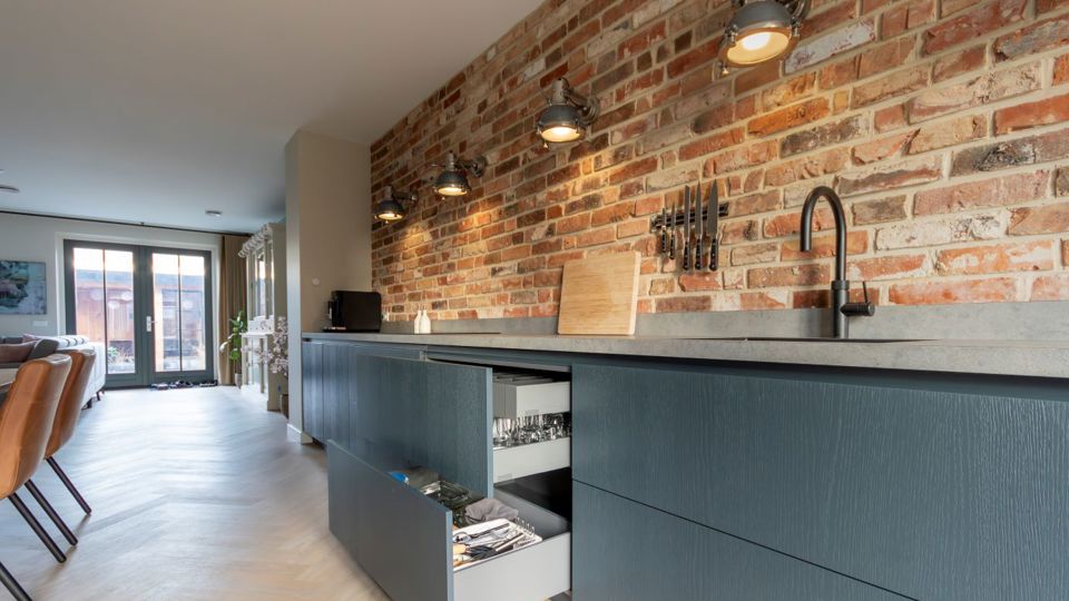 Ook in een kleinere ruimte werkt een industriële stijl verrassend goed. De truc is om één duidelijk statement te kiezen: een zwart stalen rek of een baksteen(look) wand. De rest houd je rustiger, met lichte tinten en slimme kastruimte. Zo behoud je de industriële uitstraling, maar blijft de keuken ruimtelijk en praktisch.