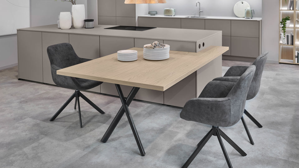 De keuken staat niet op zichzelf, maar vormt een vloeiend geheel met de leefruimte. Materialen, kleuren en styling lopen naadloos in elkaar over.