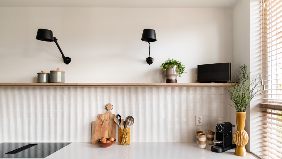 Een Scandinavisch Japandi keuken voelt pas echt rustig als de zichtlijnen kloppen. Denk vooruit vanuit de woonkamer: wat zie je als je op de bank zit of aan de eettafel in je woonkeuken? Plan dan bewust een aantal stille zones. Een stille wand bestaat uit hoge kasten zonder onderbrekingen, dus geen losse plankjes overal. In de stille werkzone staan zo min mogelijk apparaten in het zicht; broodrooster en airfryer verdwijnen in een kast of apparaten kast. Creëer ook een stille open zone: één open vak of nis met twee of drie mooie items, niet meer. Zo blijft het geheel luchtig, ook in kleinere Nederlandse keukens.