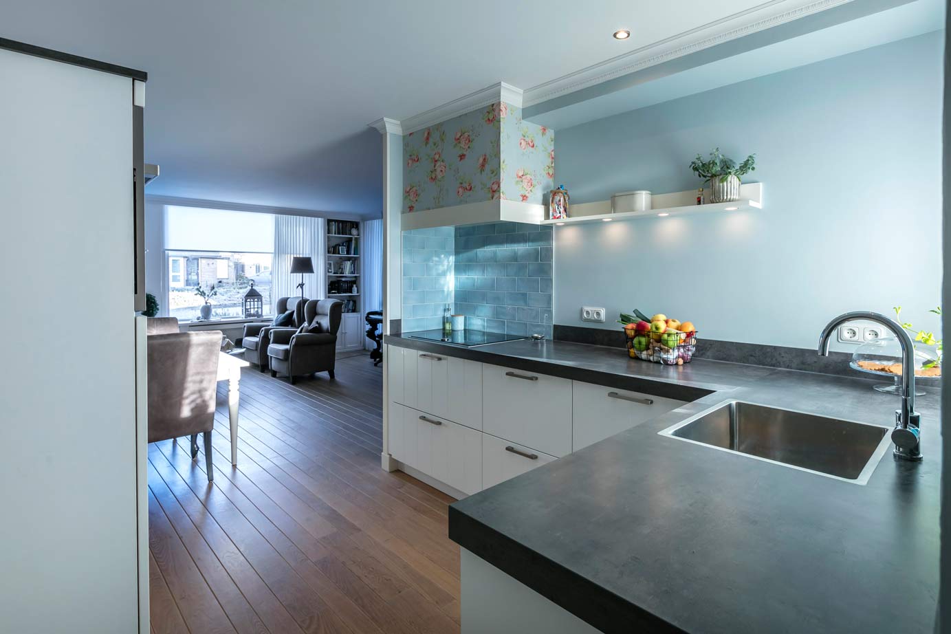 “Ik zag daar een bezwaar in en koos om een witte keuken te nemen. Dat vind ik ook mooi en minder spannend dan een houten keuken bij een houten vloer.”