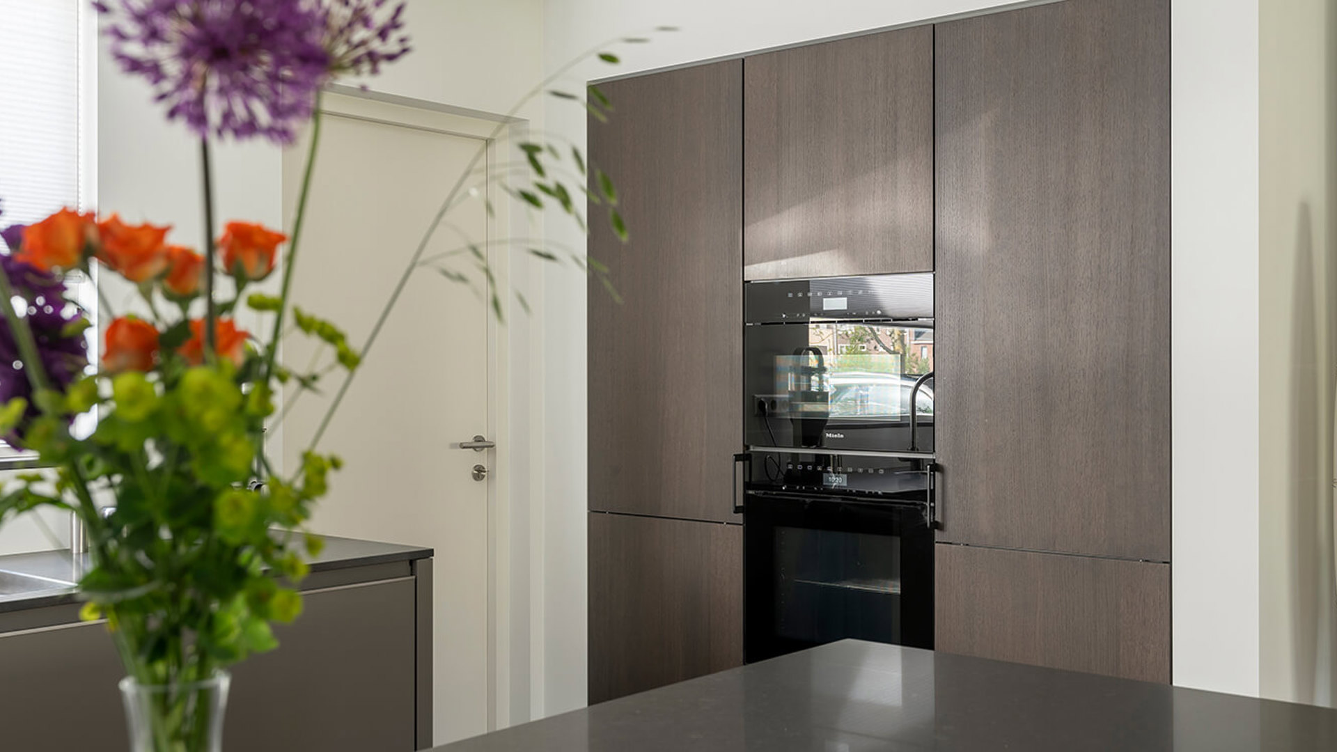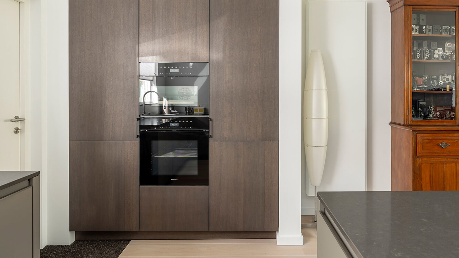 Beiden hebben liever geen combi koel- en vrieskast in de keuken. Ze kiezen voor een grote koelkast binnen handbereik. De grote vriezer met acht lades komt in de bijkeuken te staan. Alle keukenapparatuur in deze keuken is van Miele.